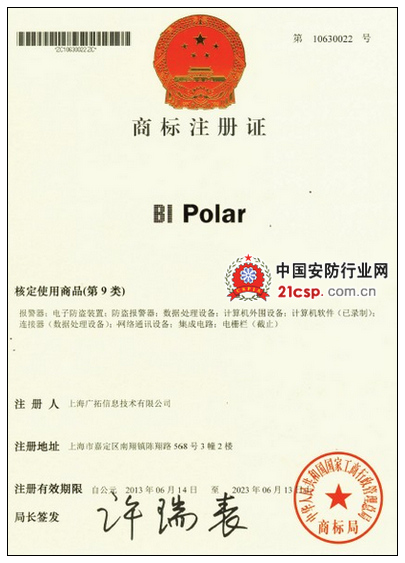 经过中华人民共和国国家工商行政管理总局商标局的认定,广拓的bi-polar商标已经获得商标注册证。这意味着广拓将在多项商品上获得bi-polar商标的专用权,并受到法律的保护。